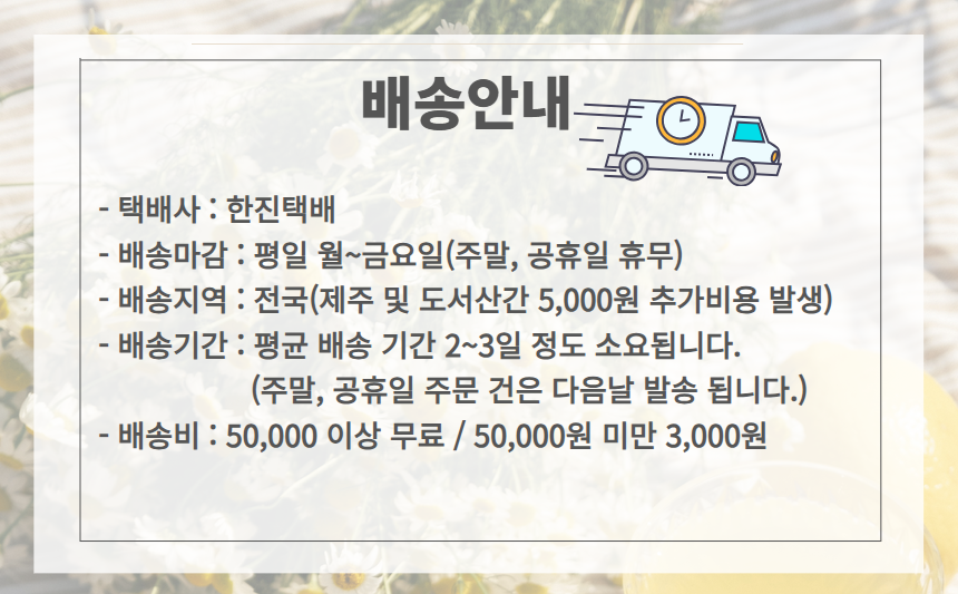 배송비 | 3,000원 (100,000원 이상 결제시 무료배송) / 제주도, 도서산간 추가배송비 있음.
